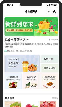 生鲜配送小程序,不依赖于第三方平台的渠道,同时可以 自主发挥自我服务特色。相信很多用户喜欢进行线上邮购 水果,他们价格实惠新鲜,并且省去了到店挑选时间。